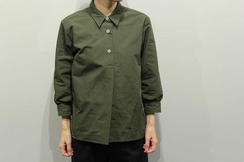 アーミーシャツから着想を得てデザインされ、前後差のある着丈、大きいスリット、プレーンに仕上げた前立てとボタンのバランスが絶妙でキャラクターのある仕上がりのプルオーバーシャツです。