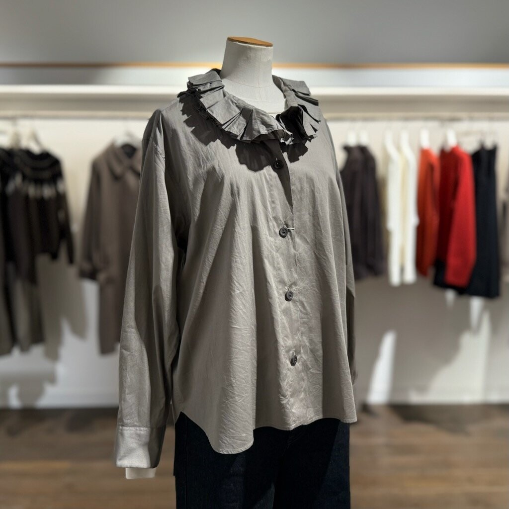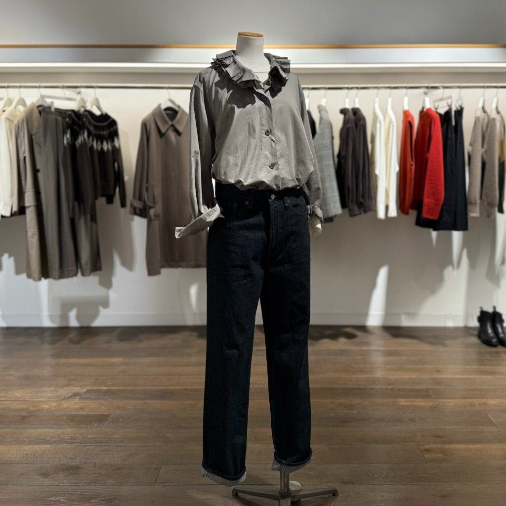 スタイルは新型のフリルカラーシャツになります。