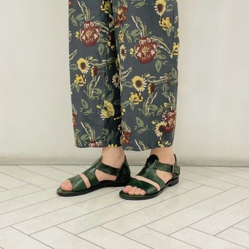 ヴィンテージ風の色合いが雰囲気ある花柄のパンツ。