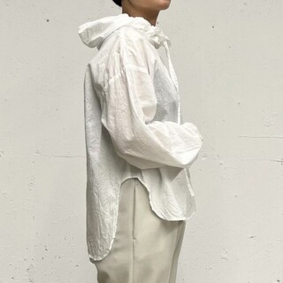 首元スッキリのノーカラーシャツ。