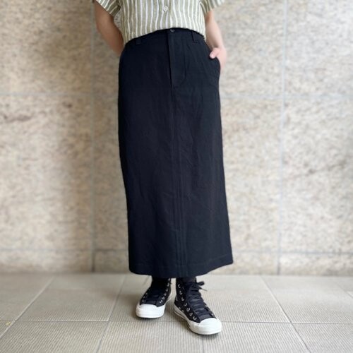 形はシンプルで、ヴィンテージのトラウザーをベースにスカートに落とし込んでいます。